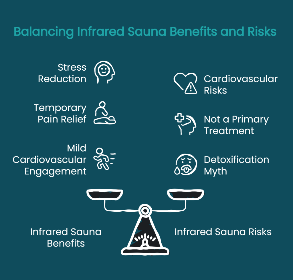 Infrared sauna use should be approached as a complementary wellness practice for relaxation and temporary symptom relief, not as a medical treatment for chronic conditions. When used appropriately by healthy individuals with proper hydration and session management, the acute physical risks remain low and manageable.