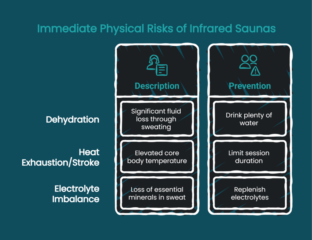 - Heat Exhaustion or Heat Stroke: While less common in the controlled temperature of a modern infrared sauna compared to a traditional Finnish sauna, staying in too long can elevate your core body temperature to dangerous levels. Symptoms like nausea, lightheadedness, and vertigo are warning signs to end your session immediately.