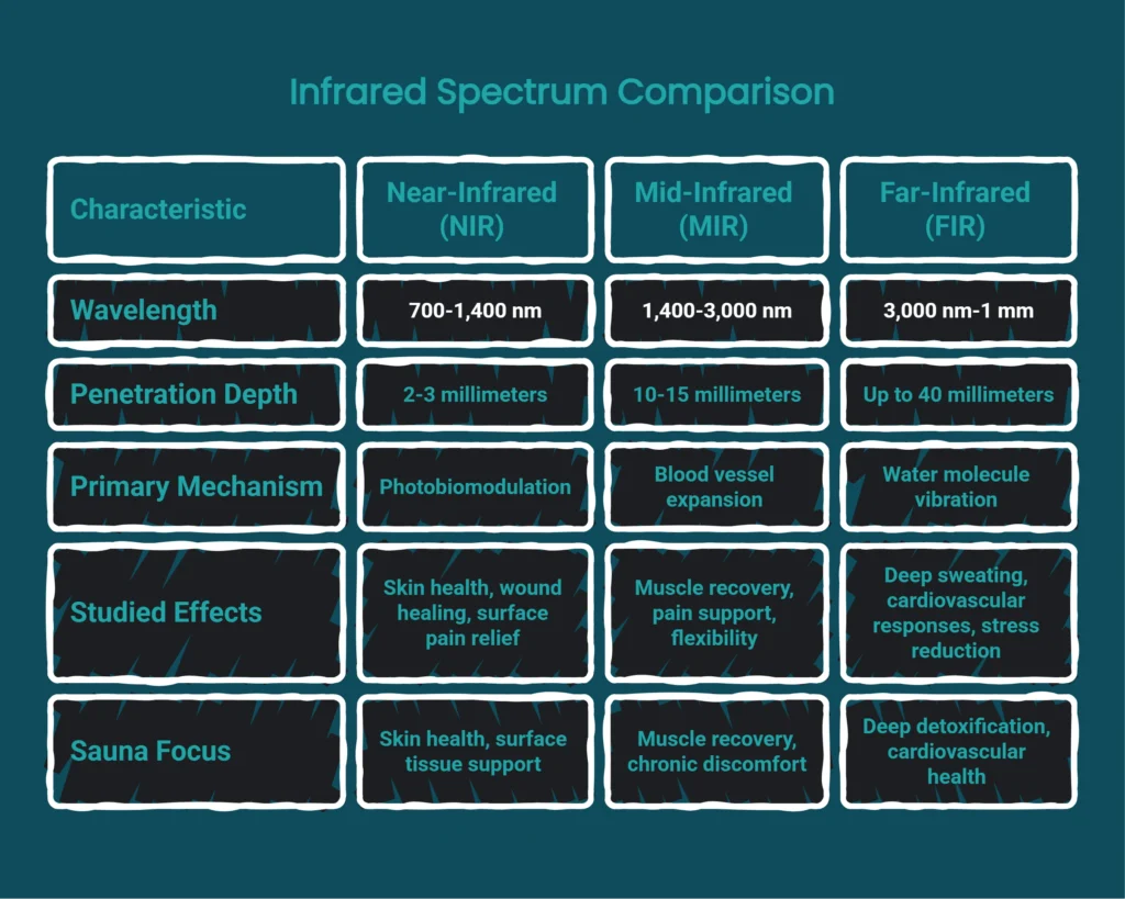 Not all infrared light is created equal. The term “infrared” covers a wide range of wavelengths, and the specific effects of an infrared sauna depend on which parts of the spectrum its heaters produce. A high-quality, full-spectrum sauna utilizes heaters that emit near, mid, and far infrared waves, each targeting the body in distinct ways.
