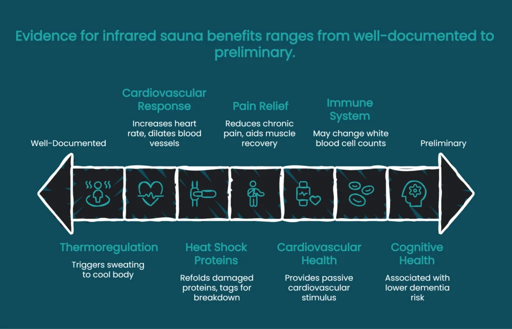 The most valuable approach is understanding which mechanisms are supported by strong evidence (thermoregulation, cardiovascular response, heat shock proteins), which show moderate associations (pain relief, inflammation markers), and which remain preliminary (cognitive health, immune markers). This evidence-based perspective allows you to set realistic expectations and use infrared saunas as one component of a comprehensive wellness strategy.