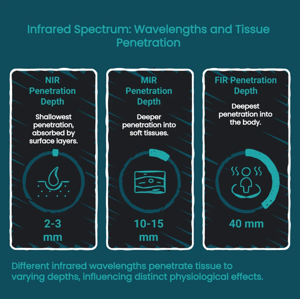 Far-infrared has the longest wavelengths (approximately 3,000 nm to 1 mm, or 3-1000 microns) and penetrates most deeply into the body—up to 1.5 inches (approximately 40 millimeters). This is the wavelength most associated with the heating and sweating effects of infrared saunas. FIR raises core body temperature, triggering profuse sweating and the production of heat shock proteins, which have been studied for their role in cellular stress response and repair mechanisms.